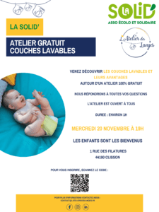 La Solid’ accueille l’Atelier des langes pour un atelier gratuit d’une heure sur les couches lavables, lundi 20 novembre à 19h à la maison de la solidarité de Clisson.