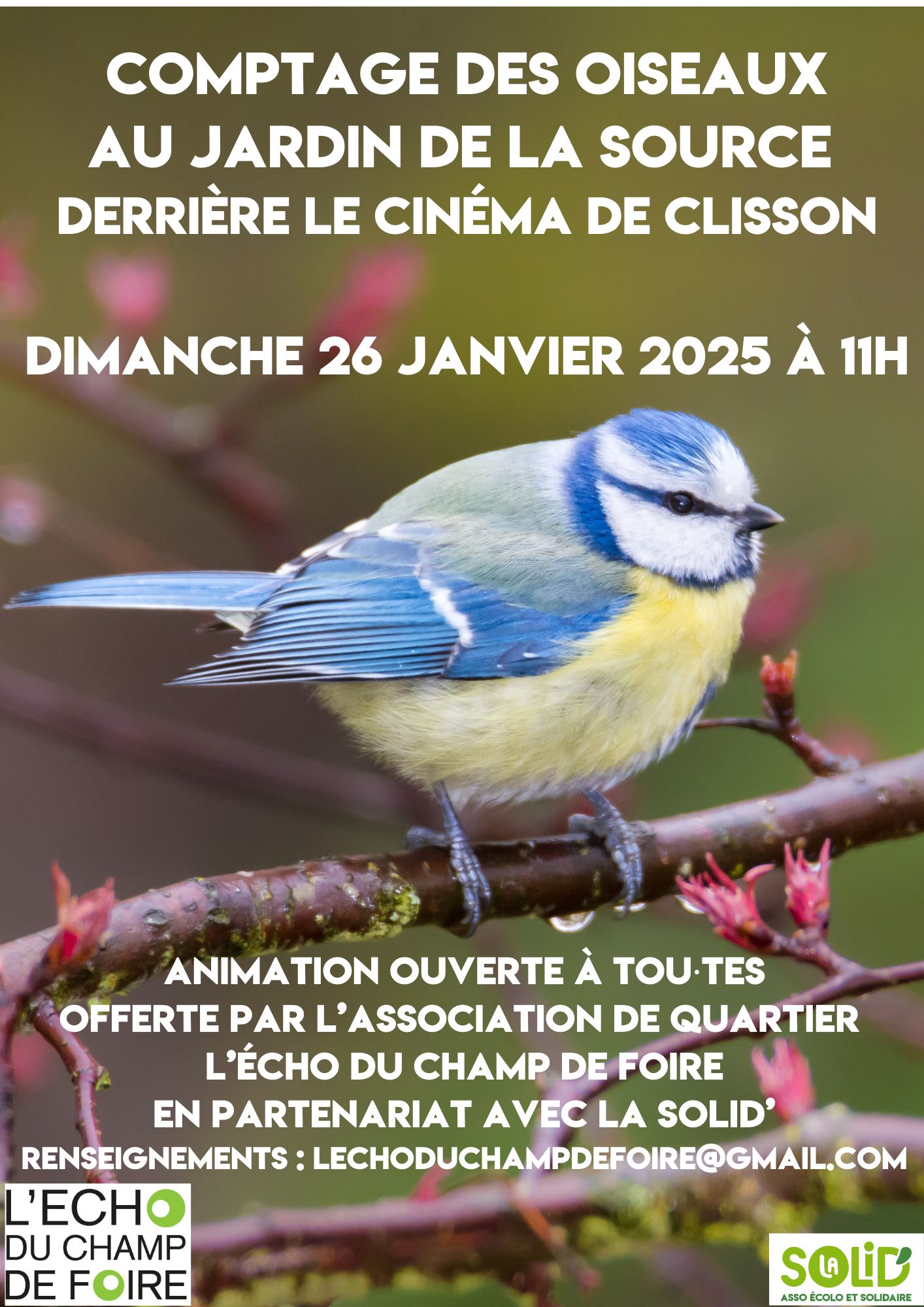 A l’invitation de l’association de quartier L’écho du champ de foire, les bénévoles de La Solid’ accompagneront les habitant·es à l’opération « comptage des oiseaux » du jardin de la source, jardins familiaux derrière le cinéma de Clisson.