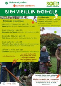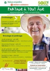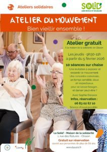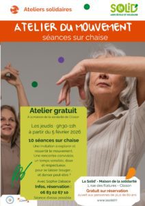 Les inscriptions sont ouvertes, pour ce nouvel atelier entièrement gratuit, réservé aux personnes de plus de 60 ans. L’atelier du mouvement aura lieu les jeudis matins à la Solid’, et sera animé par Sophie. 10 séances sur chaise. Nombre de places limité !