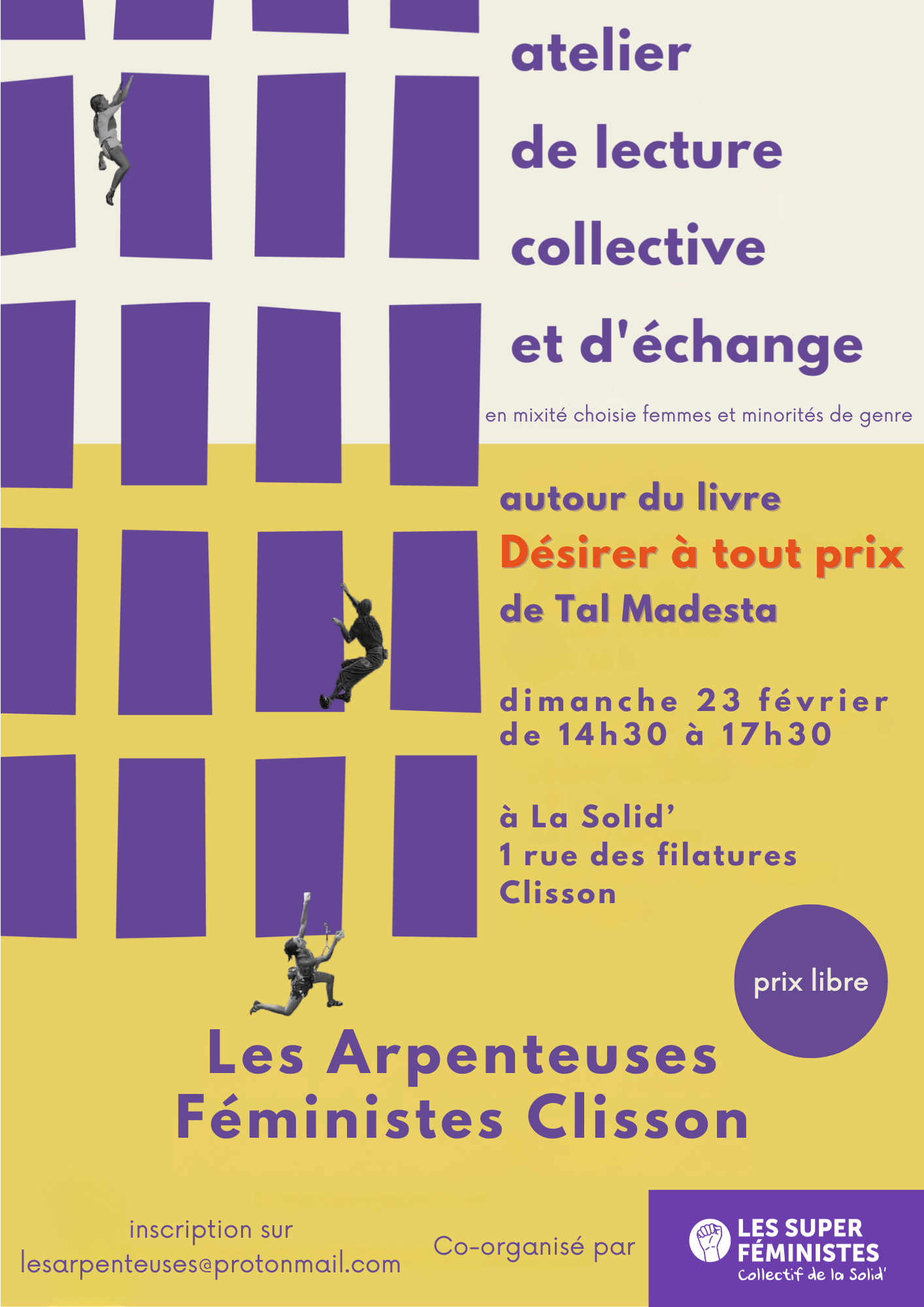 Atelier de lecture et d'échanges autour du livre "Désirer à tout prix" de Tal Modesta. Dans la salle de réunion de l'ancien bâtiment de la Maison de la Solidarité, avec les Arpenteuses féministes de Clisson. Prix libre. Ouvert aux femmes et minorités de genres.